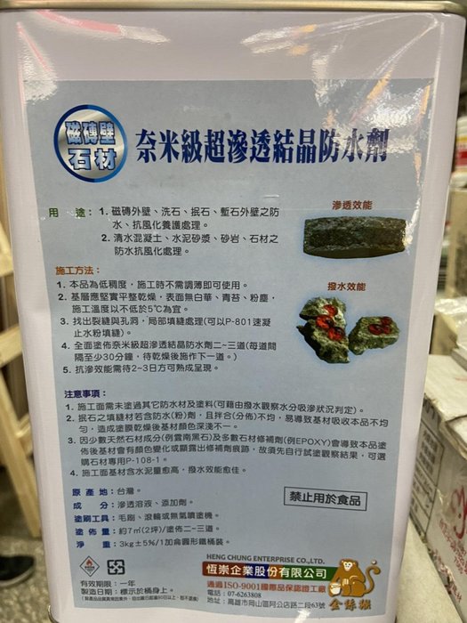 【注意事項】施工面需未塗過其它防水材及塗料(可藉由撥水觀察水分吸滲狀況判定)。抿石之填縫材若含防水(粉)劑,且拌合(分佈)不均,易導致基材吸收本品不均勻,造成塗膜乾燥後基材顏色深淺不一。因少數天然石材成分(例雲南黑石)及多數石材修補劑(例EPOXY)會導致本品塗佈後基材會有顏色變化或顯露出修補劑痕跡,故須先自行試塗觀察結果,可選購石材專用品P-108-1。施工面基材含水泥量愈高,撥水效能愈佳。