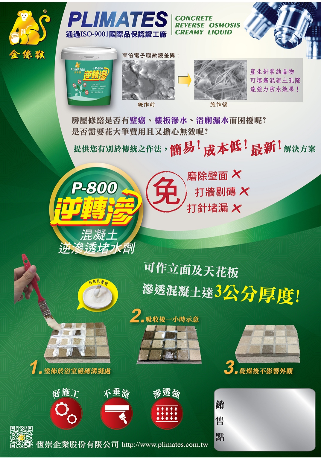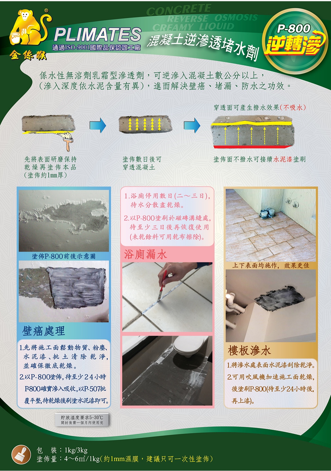 【用途】 地下室牆體、頂版(中庭地板)的逆滲透堵漏、抗滲。 減低結構體的吸水率,防治壁癌增生。 清水模面的無膜長效防水(不改變外觀)。